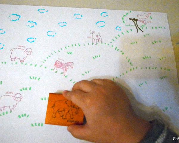 搭配著阿鼓喜歡的動物故事書-到底在排什麼呢? 讓小阿鼓用蓋印章的方式重現故事情節