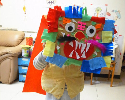 這回我們改用紙箱來玩舞獅!我們家可愛的獅面鼓身! 來向大家說聲恭喜恭喜,新年快樂