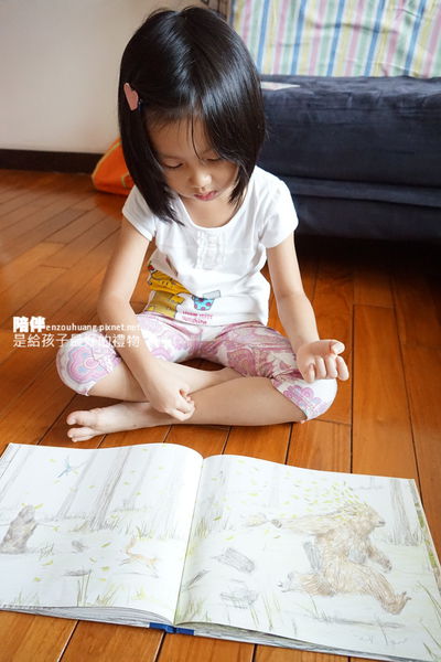 五歲五個月的她已經相當能夠表達自己的見解,立刻翻到有太空船的那一頁,說自己最喜歡這裡,原因是:很有趣,也很有想像力。並且覺得大熊被追著跑那一頁,很好玩!