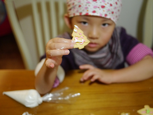 阿妞很寶,他說要拿糖霜裝飾,我也由著她去,一回頭發現她繞著聖誕樹外圍再繞圈圈,跟他說要塗在餅乾上才吃的到阿。