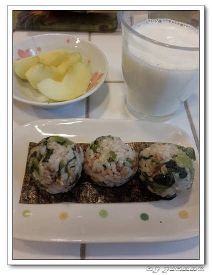 雪菜肉末小飯糰、牛奶、水果,冬天的季節,盛產小芥菜或蘿蔔葉可以拿來做雪裡紅,雪裡紅炒肉末放在冰箱裡,隨時拿出來拌飯拌麵都很開胃(雪裡紅的作法請點選自己做好吃的雪裡紅)