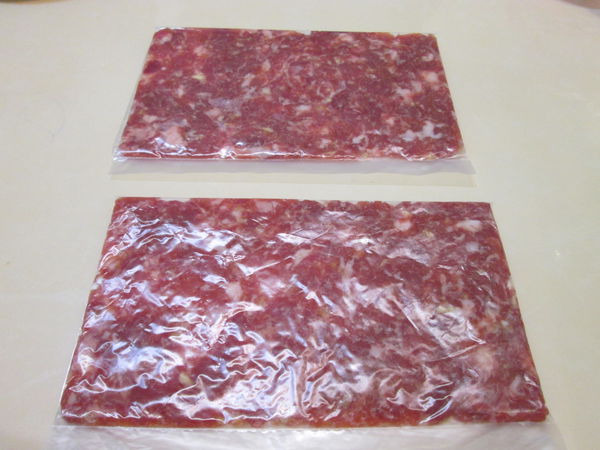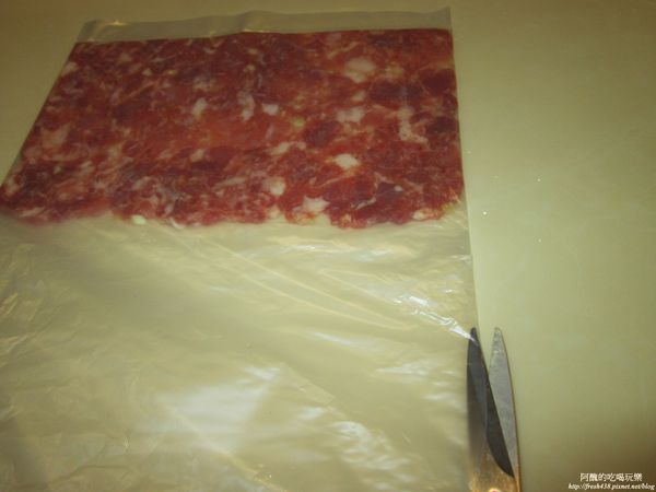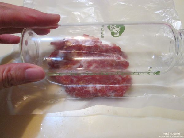 用擀麵棍或奶瓶擀平肉泥,