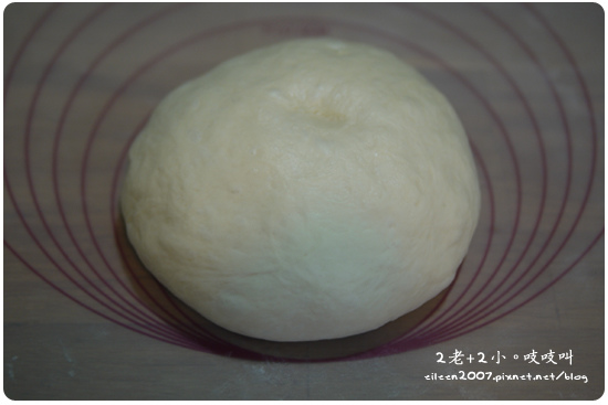 3) 待麵包機『14(麵包麵糰)』模式結束後取出麵糰,工作桌面上撒上少許高粉,將麵團倒在桌面上,以手掌輕拍麵團將內部大氣體排出,分割成8等份揉圓用保鮮膜蓋住鬆弛20分鐘。