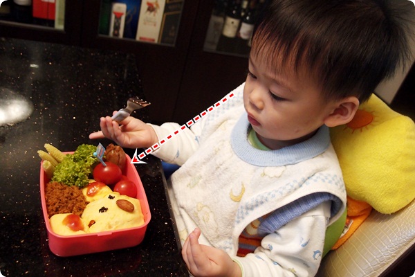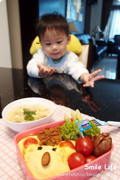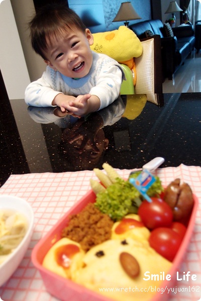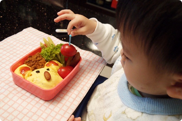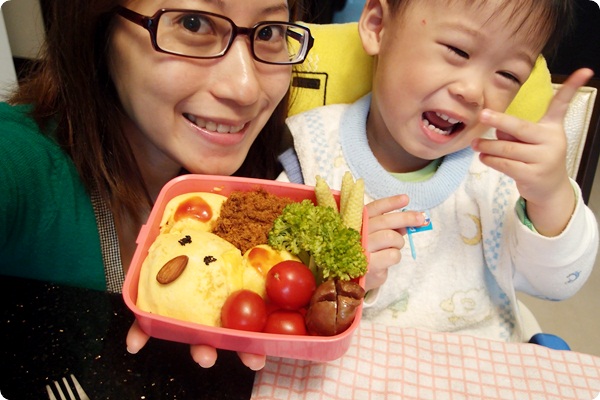 媽咪:「好啦!好啦~~我們起跟熊熊便當照張相就可以開動囉!」