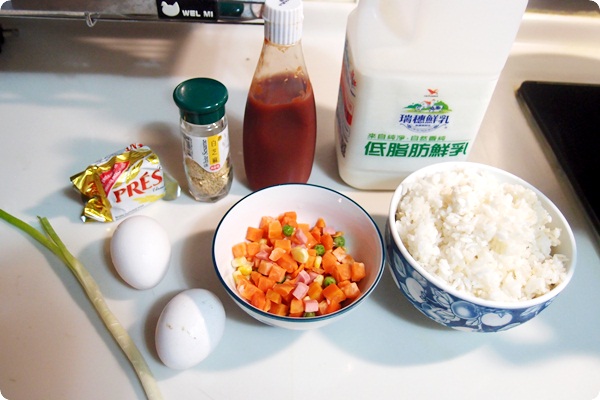 隔夜白飯/冷凍三色豆/雞蛋2顆/青葱/鮮奶