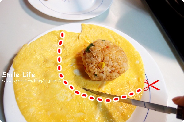 再把三個小圓放在蛋皮上,保留包覆該有的範圍,用刀子或剪刀預留順勢剪開~