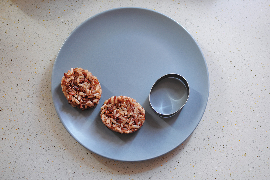 6. 利用餅乾模具將糙米飯壓出飯糰,將玉子燒放在飯上,再放上裝飾用的海苔。