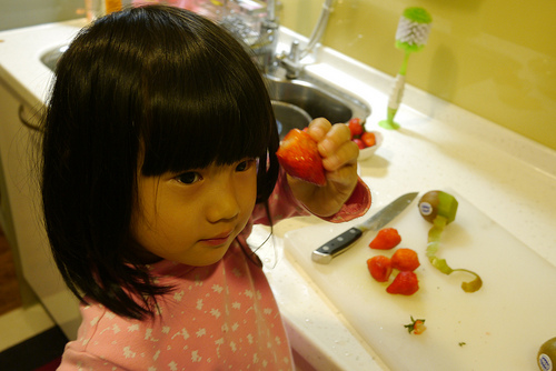 媽媽削奇異果皮的同時,請阿妞先幫草莓去掉蒂頭。草莓洗淨後,要先把蒂頭的葉子撥起來,才能夠看到蒂頭要切在哪裡,盡量不要切到太多草莓。