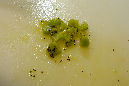 媽媽削好皮的奇異果,換阿妞切奇異果丁,媽媽切草莓丁