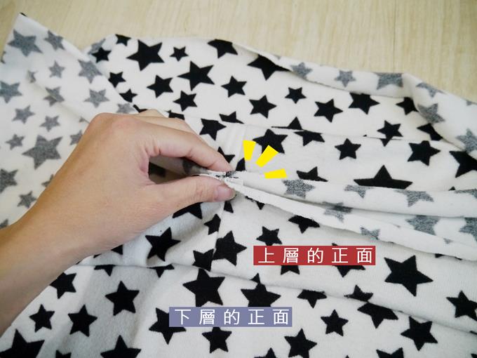 4.再抓住下層布的兩端,對齊後可用夾子或珠針固定。(上層布會先被包在裡面) 再將邊邊縫起來。