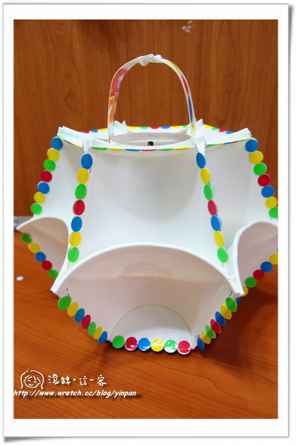 於是望著一堆之前收集的早餐紙杯,隨意的剪裁亂兜後,做了一個有點像燈罩、又有點像花藍的"紙杯燈籠",裝上七彩LED燈泡後,效果還頂不錯的呢!