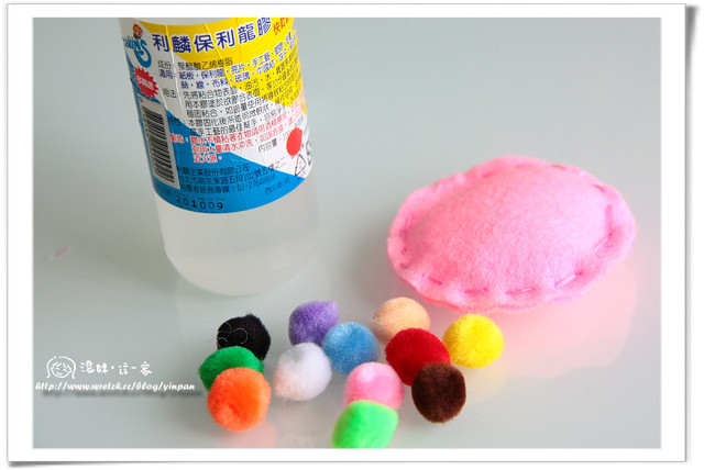 步驟三: 準備幾顆小毛球,以保麗龍膠黏附在香包的周圍。