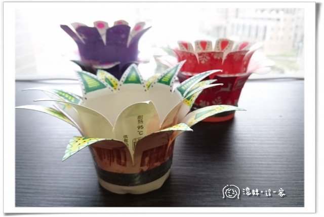步驟4:因紙杯的防水設計,所以用麥克筆或是油性筆上色加以裝飾,讓平凡的紙杯變得更出色、就像綻放中的煙火。