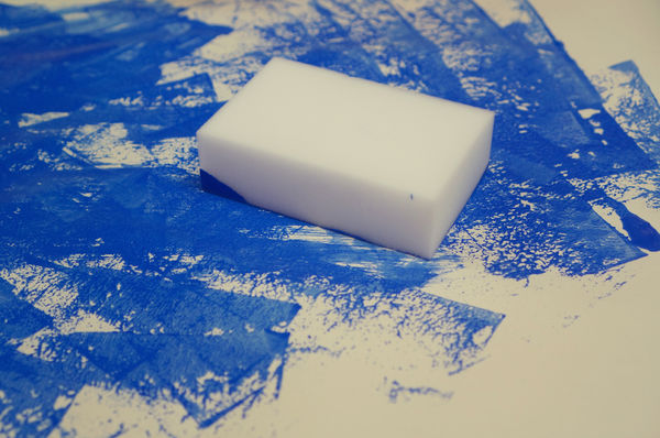 再將科技海綿用刀子對切成三角形以及小的正方形!