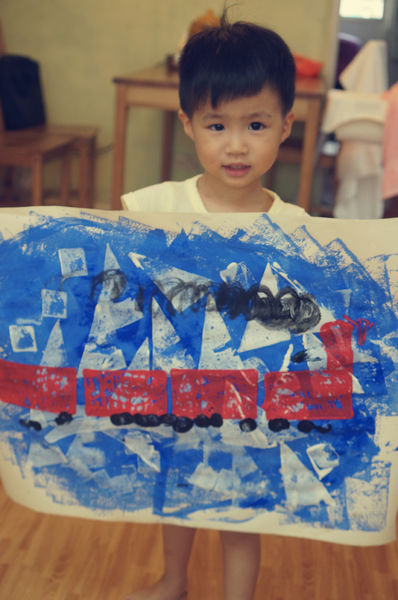 看完之後,我就跟小彥仔說,我們來畫一大片一大片冰山喔,然後我的左右手拿了一罐紅色跟藍色,問小彥仔哪一瓶的顏料,會覺得冷冷的,他很快速地選了藍色~~