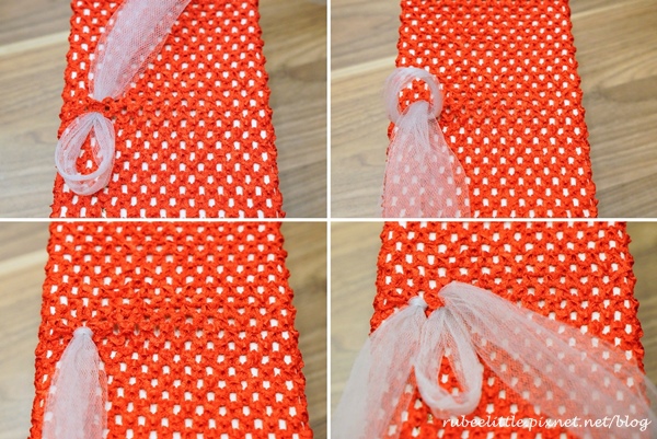 網紗的綁法就是先將網紗對折後穿過洞洞。 然後再將兩條網紗穿過對折的圈圈內。