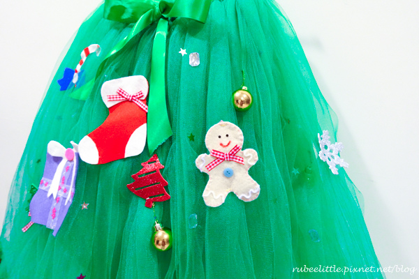 因為帶 Rubee 去看聖誕樹時,順便拍了一些照片後, 覺得裙子穿上後,好多縫上去的配件都被網紗埋住,看不太到, 覺得略顯單調,所以又回家再加工,加碼縫上更多裝飾! 讓整個洋裝可以看起來更活潑。