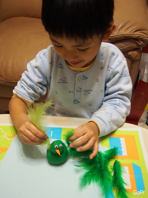 藉由小朋友將羽毛插入黏土中這個動作,可以訓練小手肌肉和手眼協調的能力!