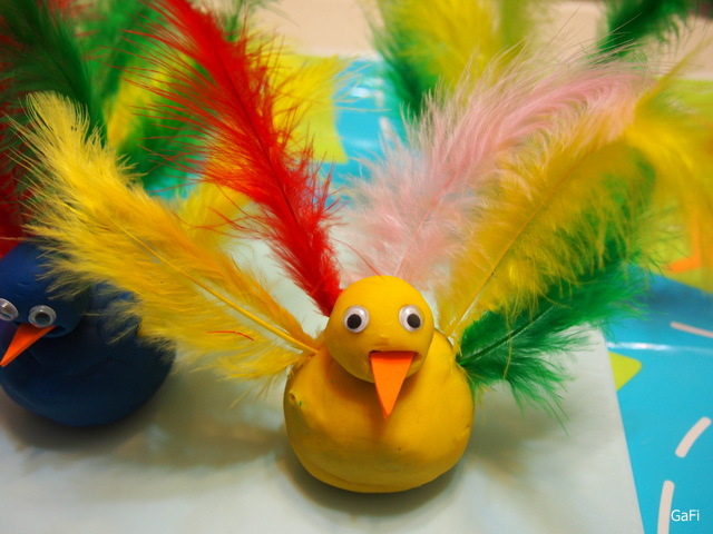 * 各色黏土和羽毛 (貓兒家中剛好有藍、綠、紅和黃色)