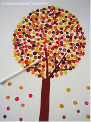 我們用鉛筆畫出樹的草圖,再拿棉花棒沾上具有秋天風格的顏料:咖啡色、橘色、黃色等色的小點點,一棵秋意滿滿的樹就完成啦!
