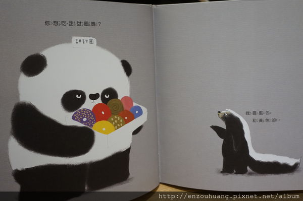 再翻到下一頁,看著環尾狐猴欣喜的吃著甜甜圈,想不到,熊貓竟然說:「我不喜歡甜甜圈」。熊貓的直接讓我覺得他很可愛,因為就算是自己不喜歡的西,也不願意隨便贈送,而是花了時間幫甜甜圈找到願意珍惜它的人(環尾狐猴)。