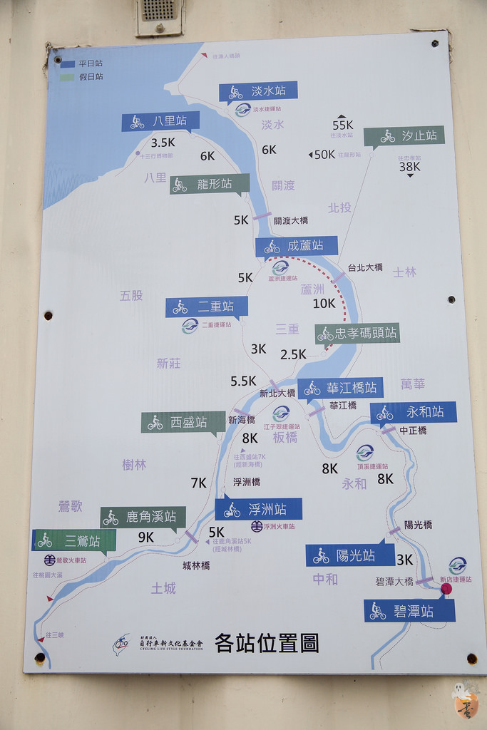 這一張則是自行車騎乘的路線圖,還有各自行車租借站的地點,大家可以考慮自己的能力決定要騎到哪一站,不過既然是親子行程,蛋拔建議大家可以騎到陽光橋站,那邊的距離比較近,而且風景也很美喔