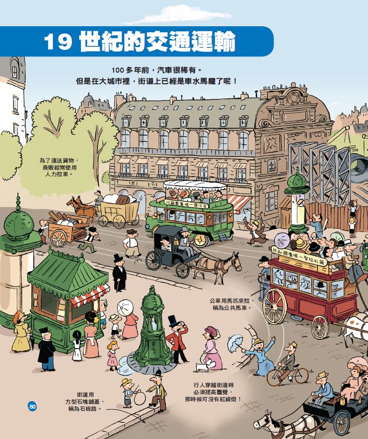 每一大洲人口的增減變化、人們穿戴的服飾、重要建築物,交通工具的進化……,各時代的世界全貌一覽無遺。