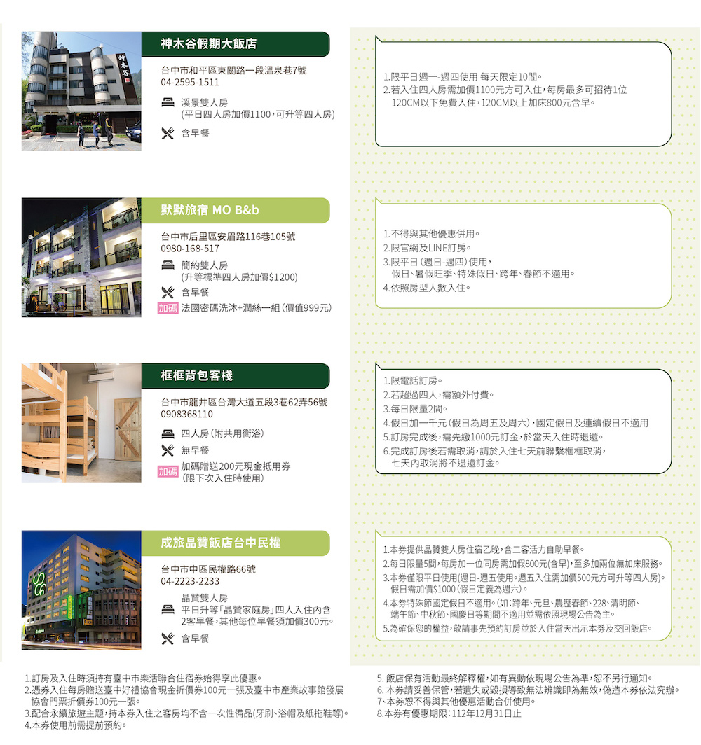 CP值爆炸|臺中樂活聯合住宿券 每張只要$2,830 (含郵資$30)