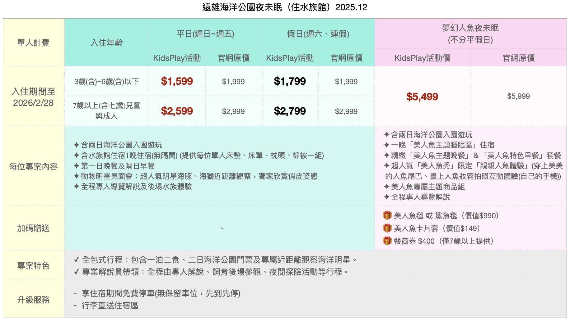 * 以上票價若有調整,將以官網公布為主,遠雄海洋公園保有票價說明之權利。