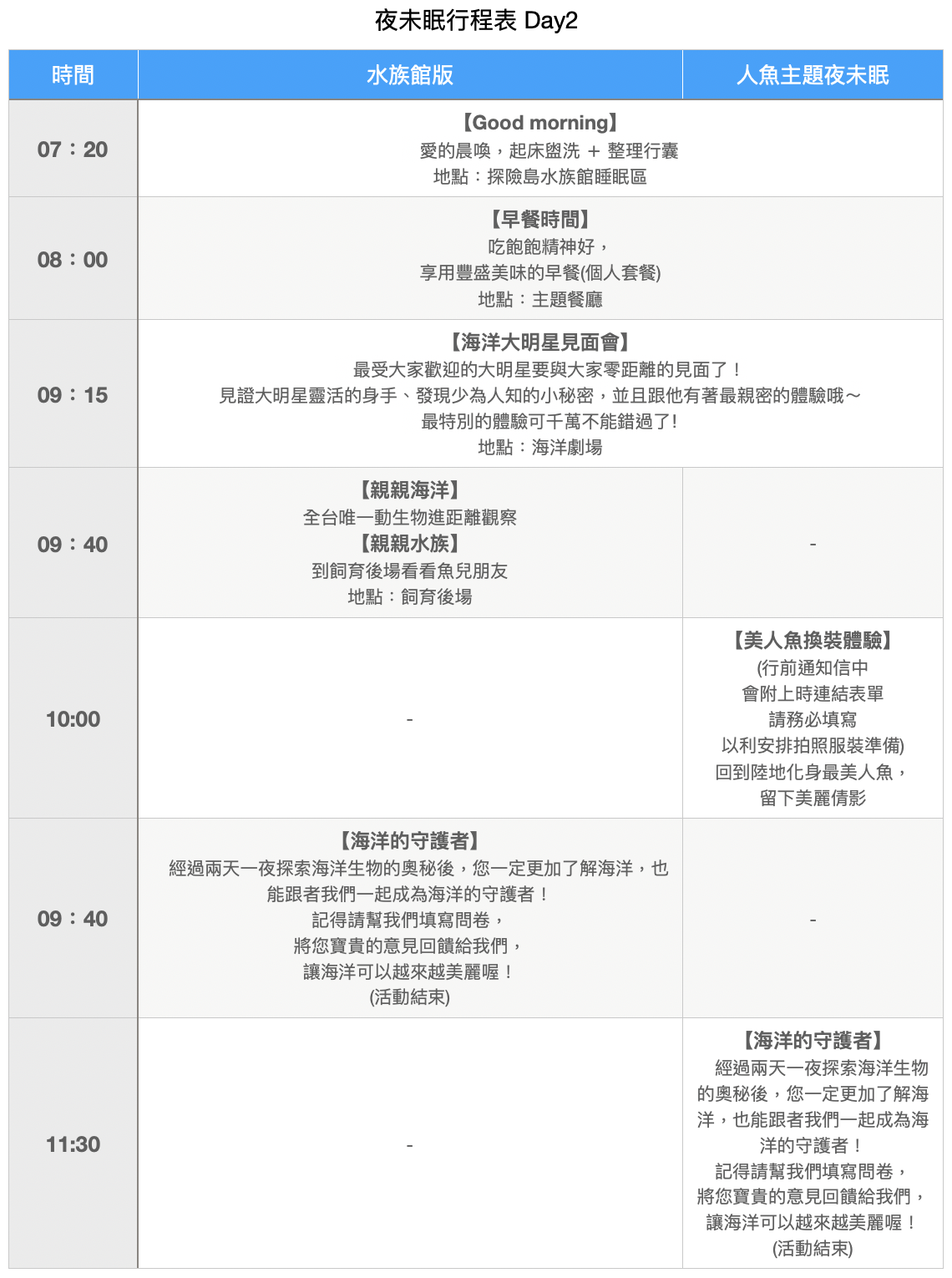 融合日間、夜間水族館探秘、專屬海洋保育課程、親子互動等內容;
