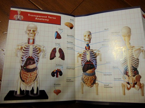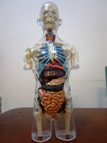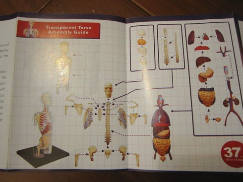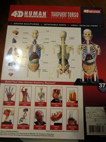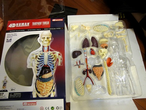 「全透視半身人體模型」: 共含37個零件,骨骼、器官及透明外殼,組裝完成後的高度為 20 cm,為真實尺寸四分之一大。此系列半身器官的模型有幾種,煦煦挑選的這款是將器官組合好後,再合上透明的外身部份,如此便能從組好的模型外看到內部器官的組成樣子,方便觀察研究。