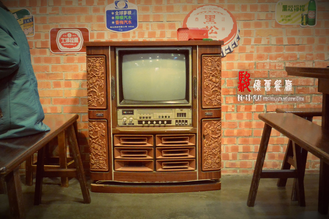 眼熟的電視機,有拉門的哦!以前家裏也有一台,還有…還有…這長板凳也是我小時候晚餐時間一定會坐在這裡吃飯的長板凳
