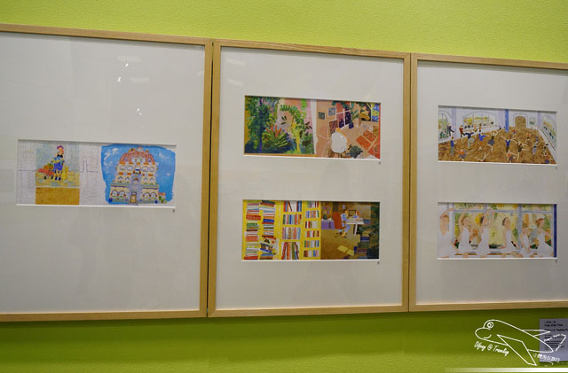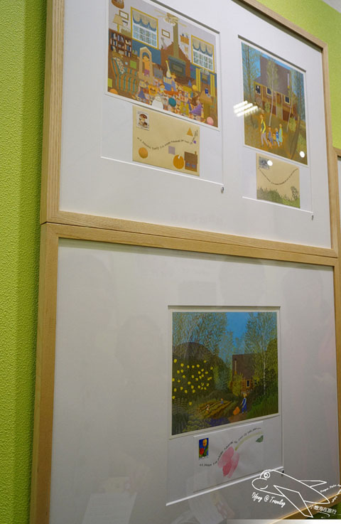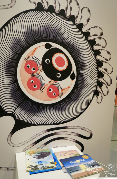 現場還有很多推薦的插畫童書,讓喜愛繪本的兩小一看到書就往前衝,然後加上我們一旁解釋,牆上這些繪畫就是書本中的某些圖片,
