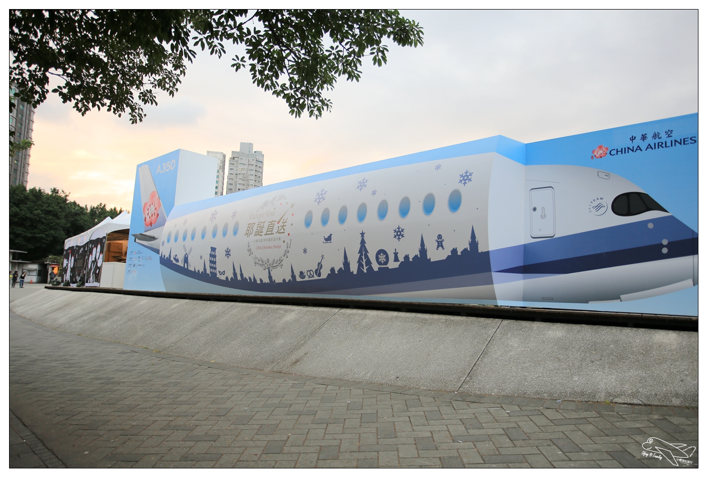 從捷運站步行而來,在戶外廣場就可以看到一台非常大的小花飛機看板,也企圖預告著A350的直飛!Difeny很喜歡看飛機,在這裡感受著飛機的感覺超級棒的!