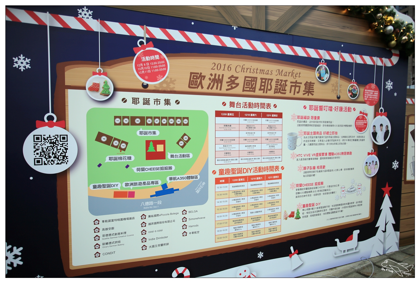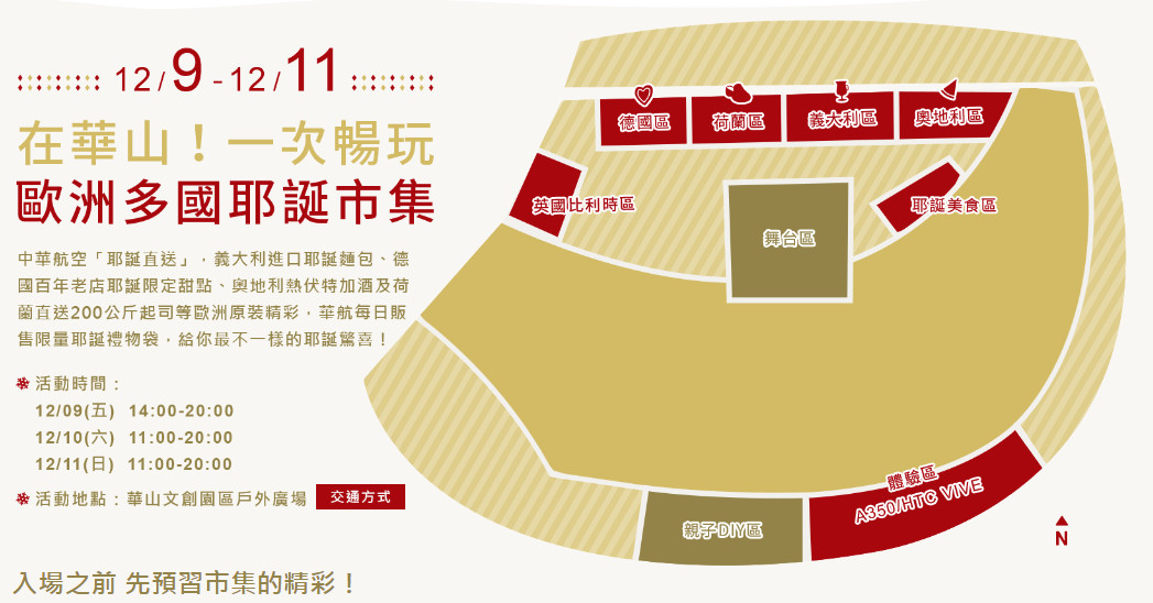 走進廣場之後,先來看看活動的簡介,活動只有三天,整個華山耶誕市級在戶外廣場區,圍繞著閃亮亮的耶誕樹舞台為中心,分別有耶誕市集區、童趣聖誕DIY區、歐洲旅遊產品區、華航A350體驗區等等!Difeny也實際繞了一圈,告訴大家相對的位置與相關的活動內容喲!