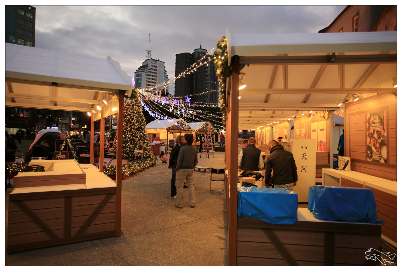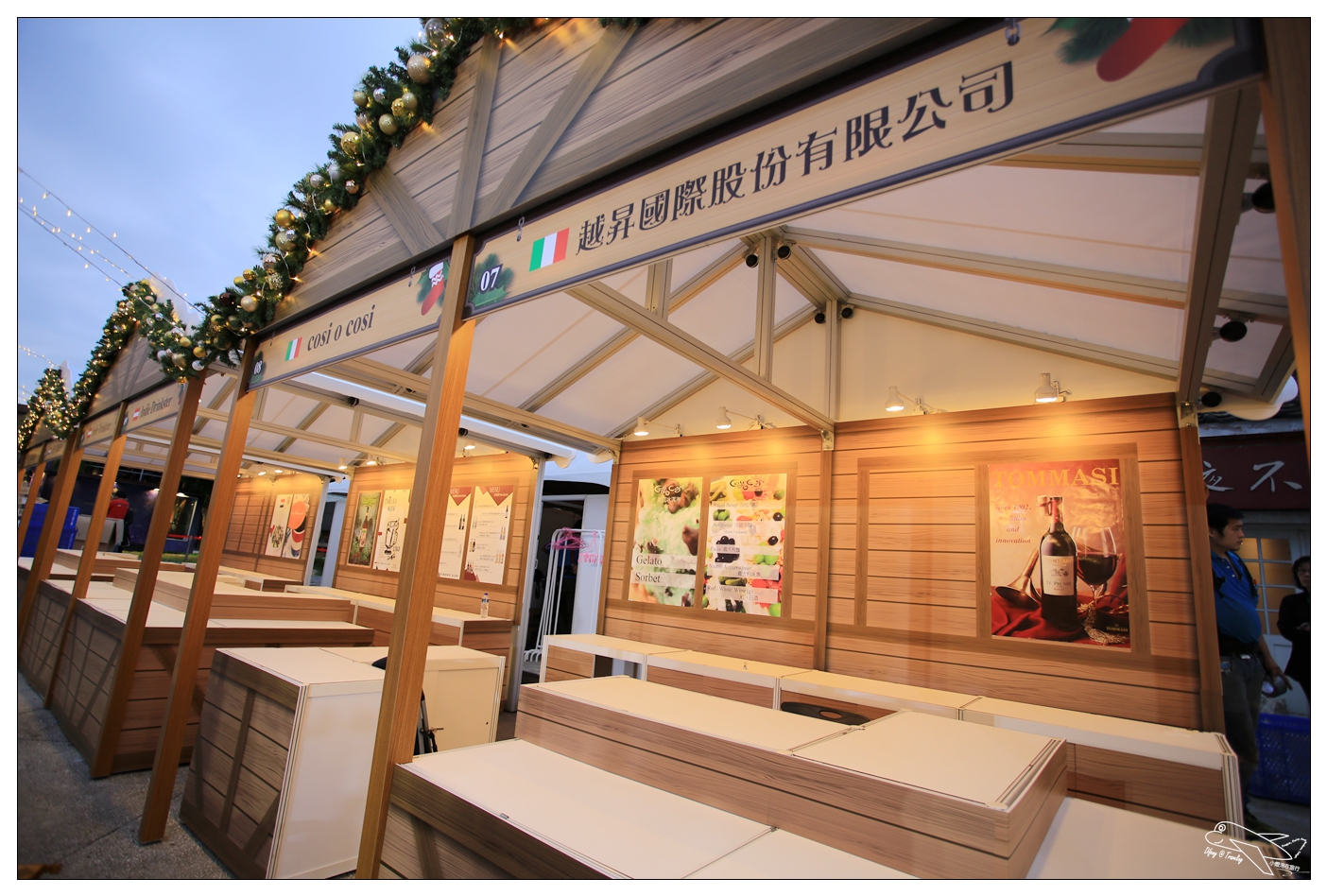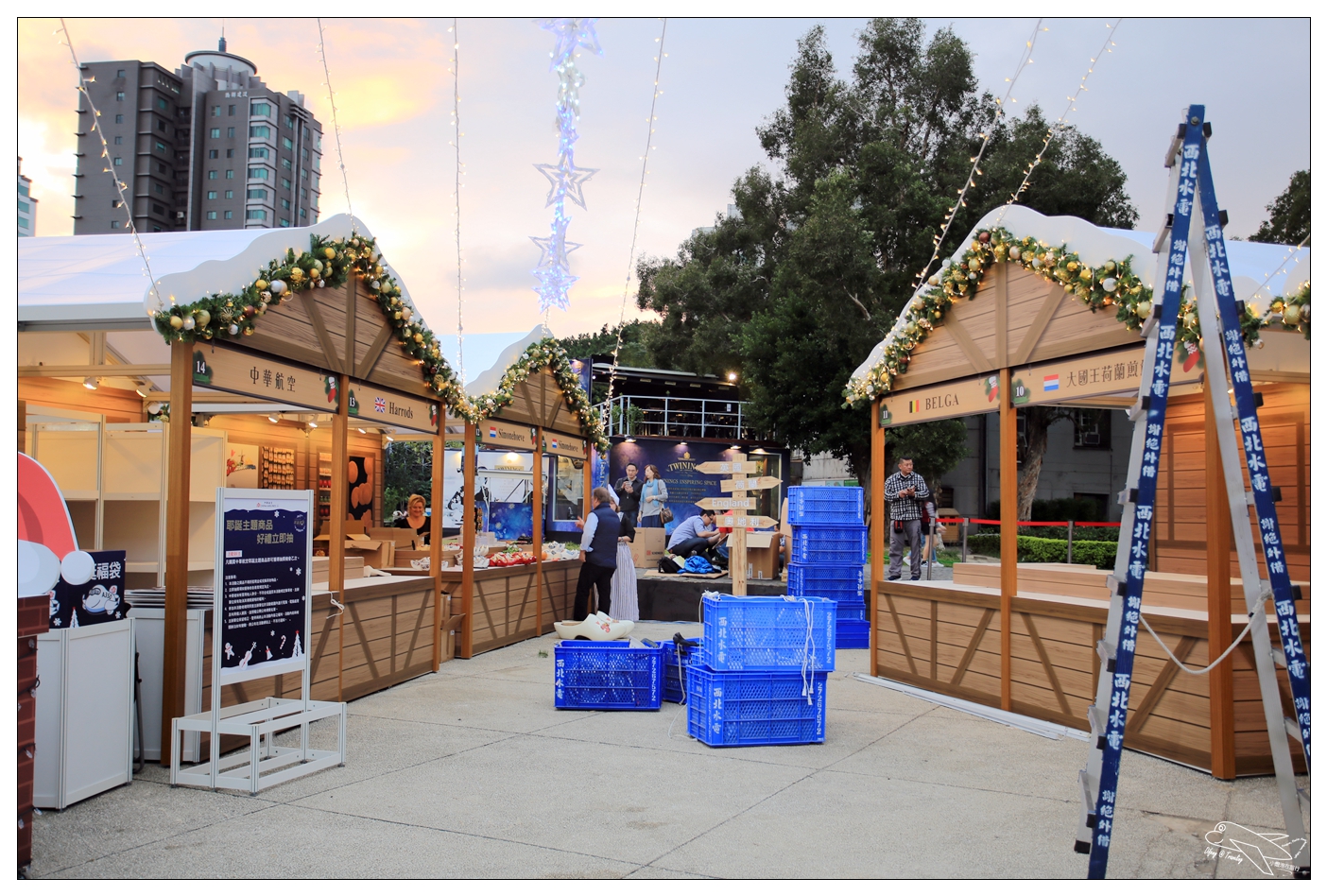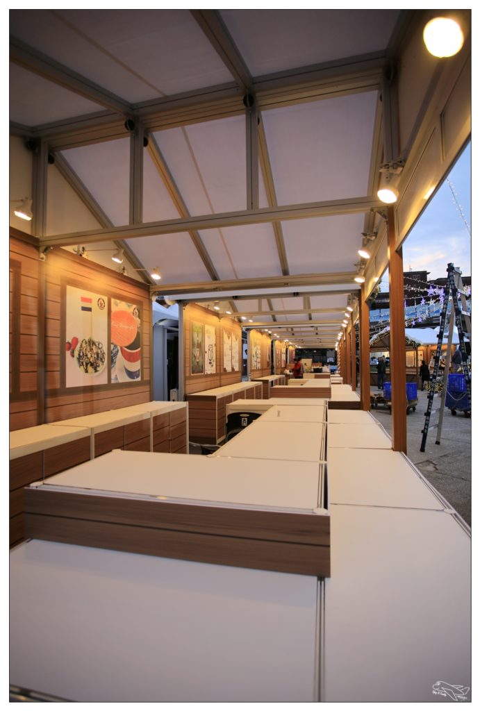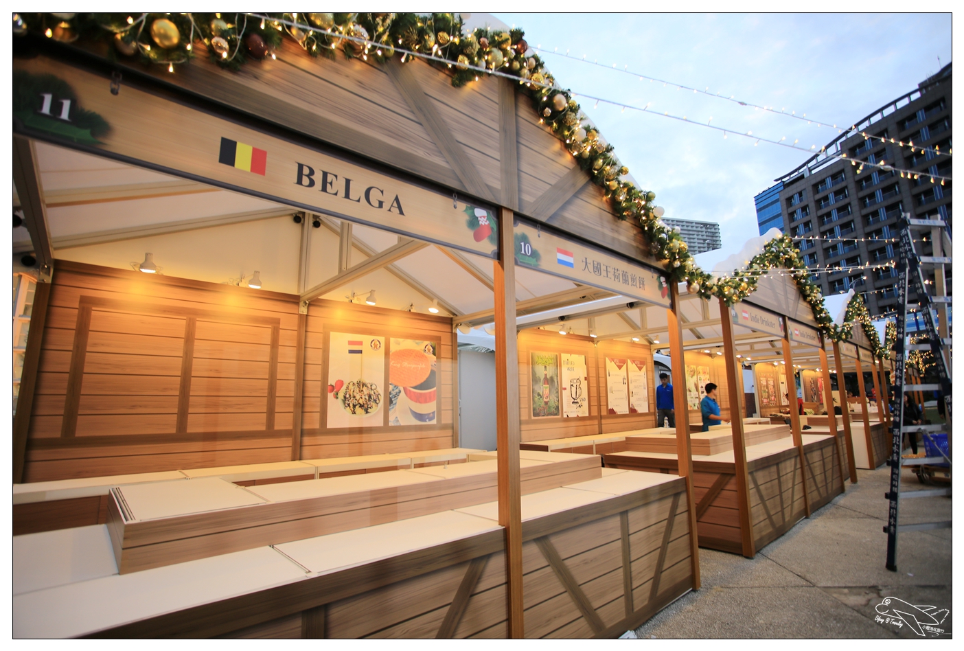 上面的聖誕樹,就是整個舞台區中心,圍繞著這棵聖誕樹由左而右的內容,今天現場看到的狀況是跟上面這張圖不太一樣,大家就參考參考,每個攤位上都有標明自己的國家國旗以及國家名稱!而因為明天才開幕,所以Difeny拍到的是正在佈置的攤位模樣,現場難免會有一些工具、道具等等!明天如果有空再去,再來補上直擊現場開幕的畫面囉!