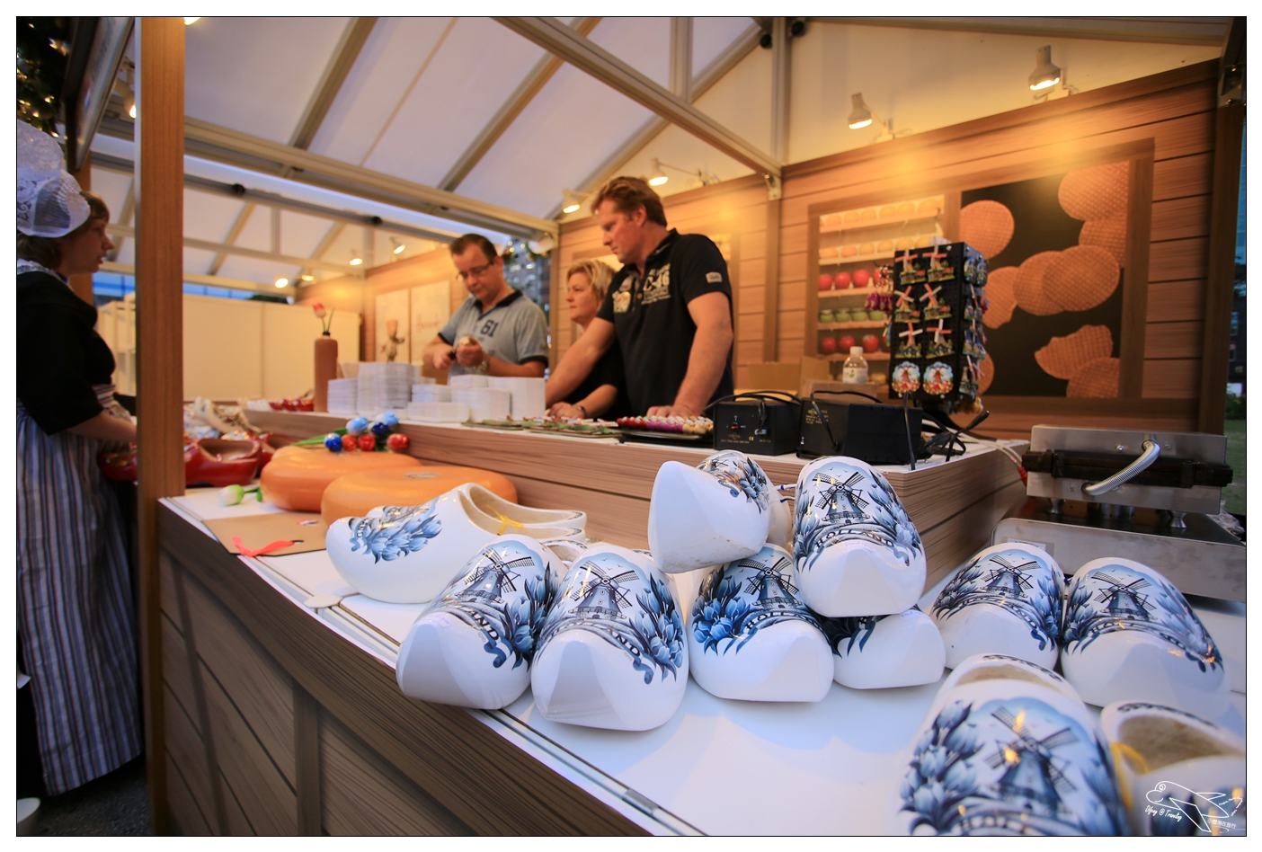 來自荷蘭的Simonhoeve首次來台耶誕直送荷蘭手工木鞋,提供不同尺寸的木鞋與現場客製化的彩繪圖案,以及荷蘭有機農場直送200公斤起司、荷蘭傳統服飾,整個就是大家熟知的荷蘭傳統風貌!荷蘭也是Difeny開始歐洲旅行的第一站,因為特別喜歡,所以也特別有感覺噢!另一家是King Stroopwafels 大國王荷蘭煎餅!這個荷蘭傳統煎餅,非常甜蜜好吃,放在咖啡上的熱氣稍稍融化之後,搭配著吃應該非常棒的享受!