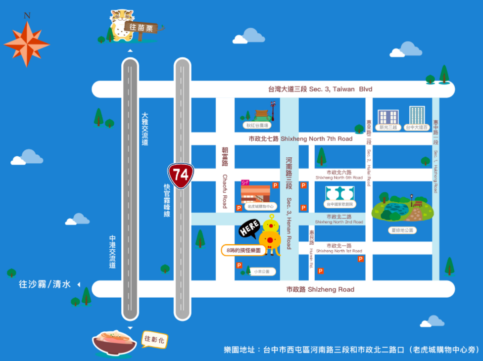 【8咘的搞怪樂園-彩虹慶典】入口處在河南路三段與市政北二路口,8咘就在門口迎接大家,很顯眼絕不會錯過!!