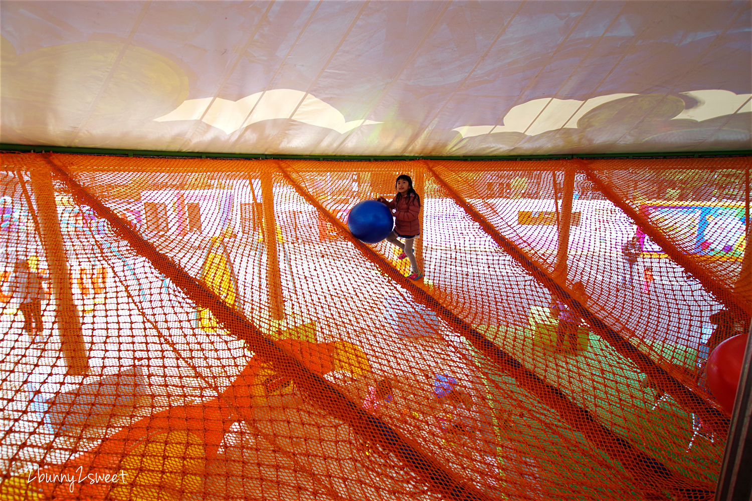 孩子們可以躲在這橘色吊網空間滾大球!(體重限制:60 公斤)