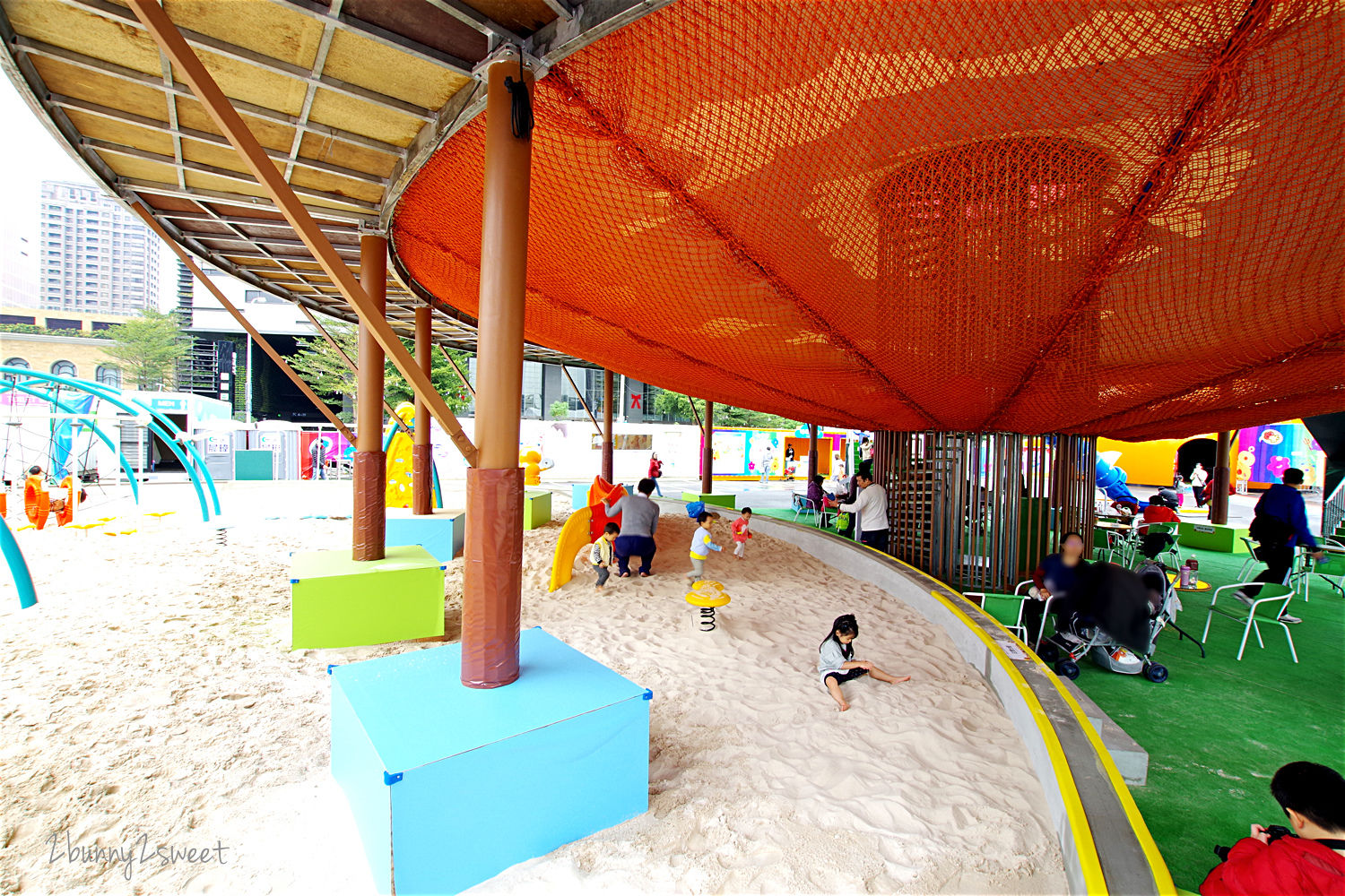 沙坑有一部分是有遮陽的,小朋友可以盡情玩沙不怕曬太陽,爸媽可以在一旁的休息區休息~