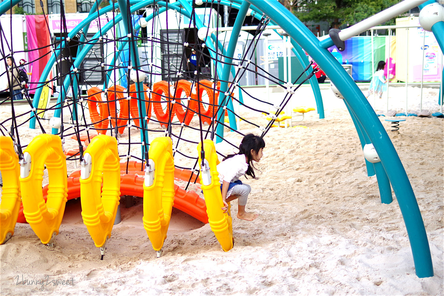 沙子很厚,感覺很像踩在沙灘上,細白沙質很乾淨好玩,要堆沙堡、挖沙坑都適合,但要記得自己帶玩沙工具唷!