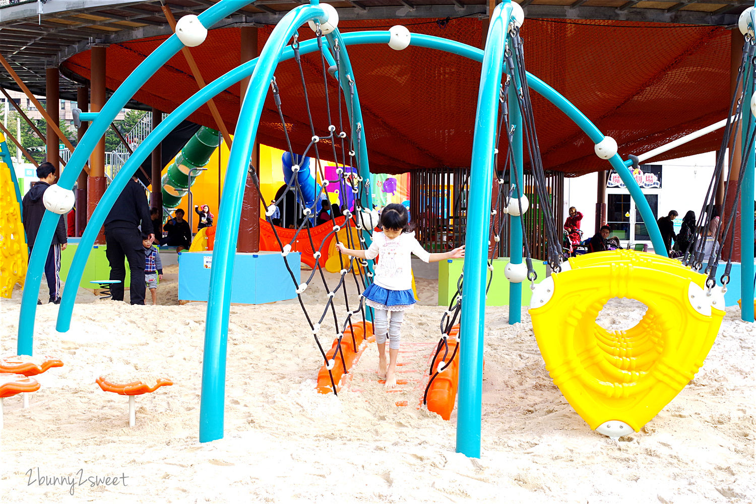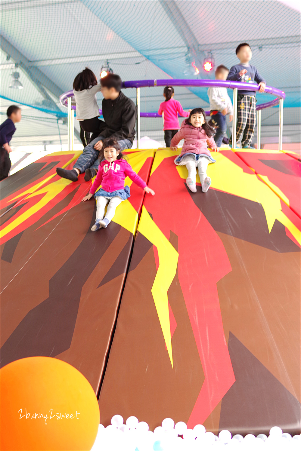 〖冒險叢林〗的彈跳床、〖秘密基地〗的攀爬網、〖沙坑體能區〗和〖波光洞穴〗兔兒毛毛都超愛,