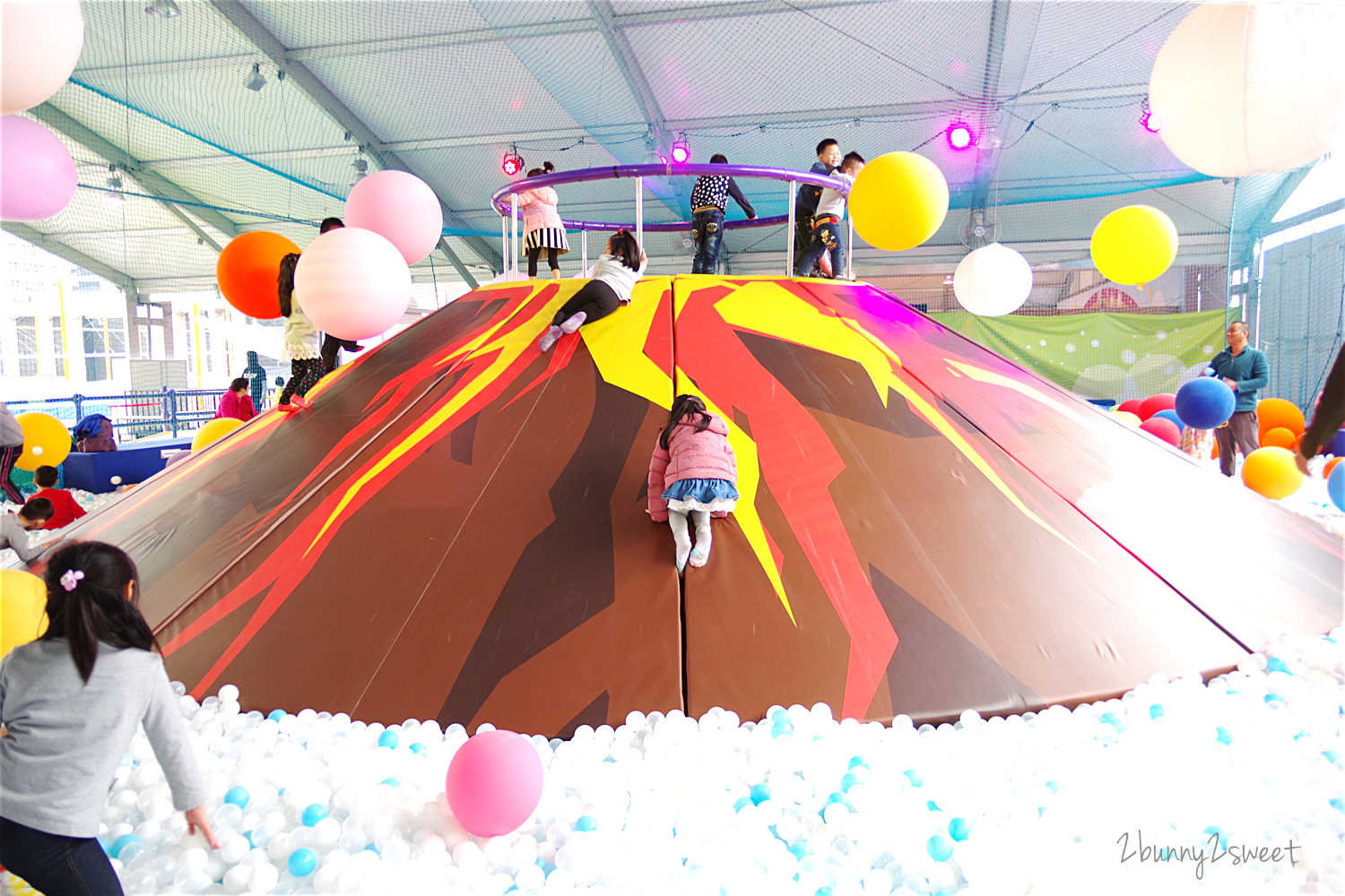 球池裡沒有滑梯,但有一座火山!火山是泡面包裹PU的材質,撞到也不會痛!