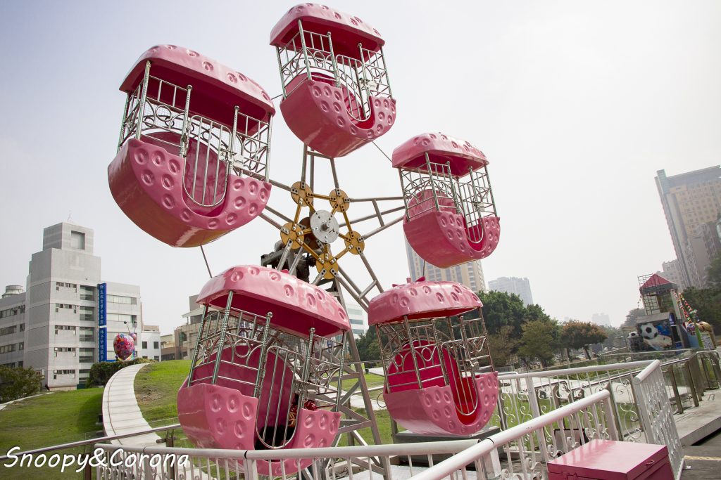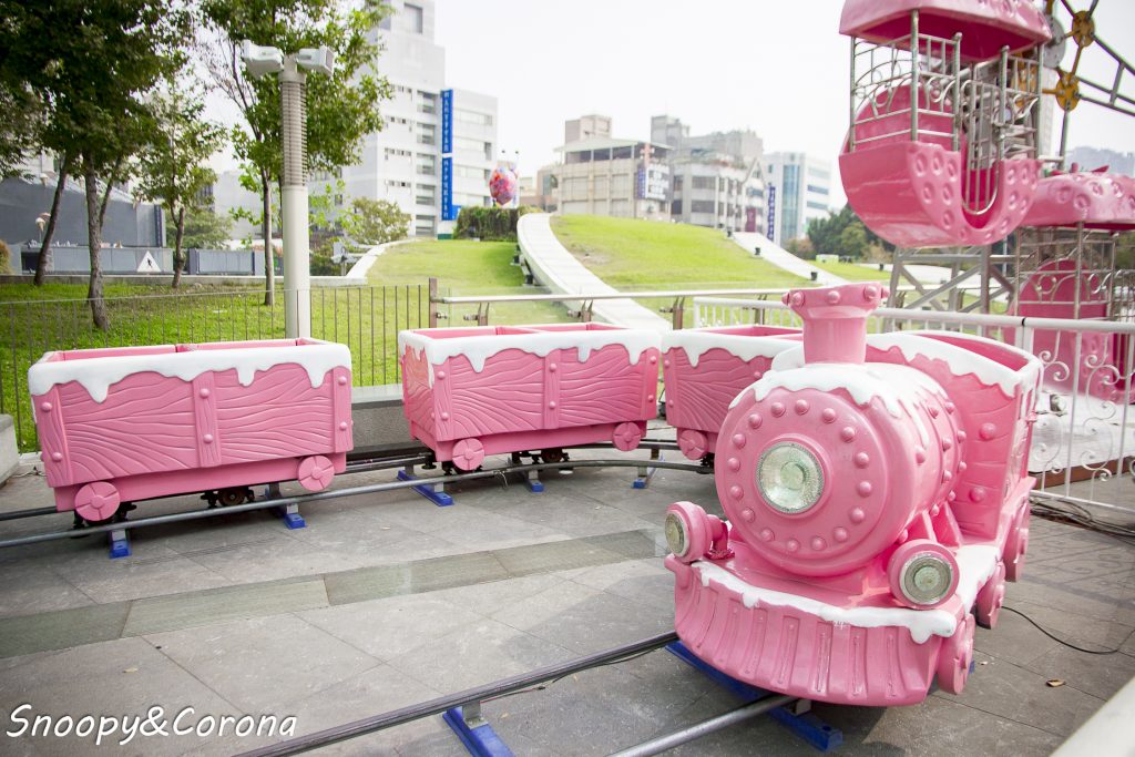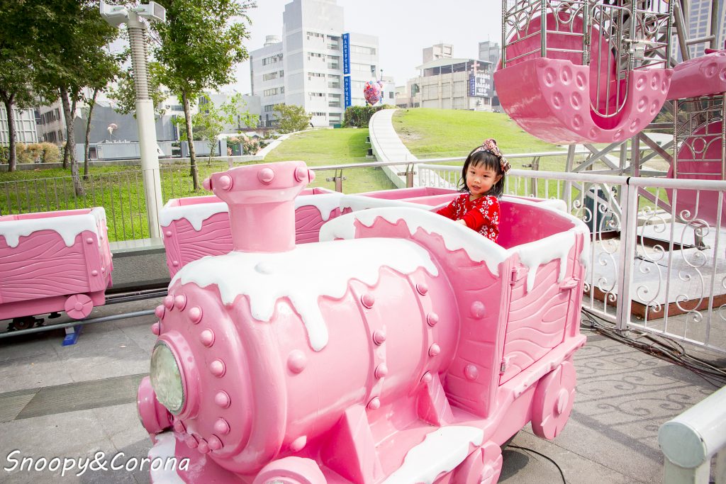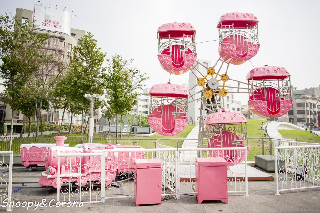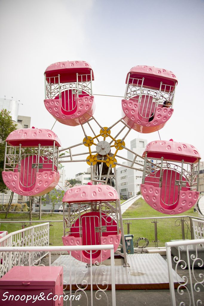 從停車場搭電梯一到廣場即看到粉紅草莓摩天輪和粉紅蛋糕小火車,