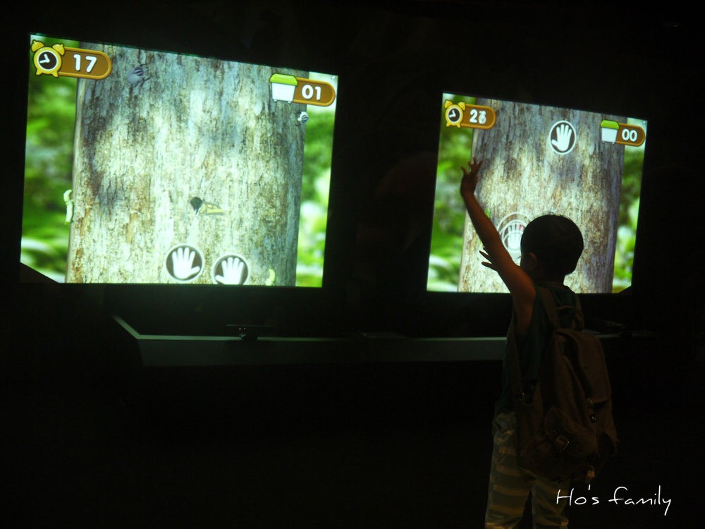「蟲蟲總動員」,樹上有很多昆蟲,包括鳳蝶、大角花金龜、鍬形蟲等,必須用雙手去捕捉,抓到就有1分。小孩玩遊戲都好拼命,搞得媽媽也好入戲,一直在旁邊大聲加油,哈哈!