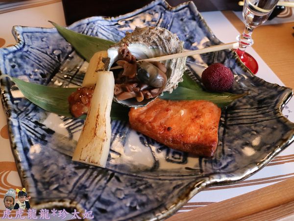 因應仲夏的季節,前幾道食材皆以和風涼食為主,青竹盛放了三種不同的生魚片,一旁更有整隻肥美的鮮蝦佐紫蘇花,來到日勝生加賀屋品嚐到不一樣的日式料理吃法,原來紫蘇花也能融入生食食材中,這是一道被紫色點綴的好浪漫的餐點~