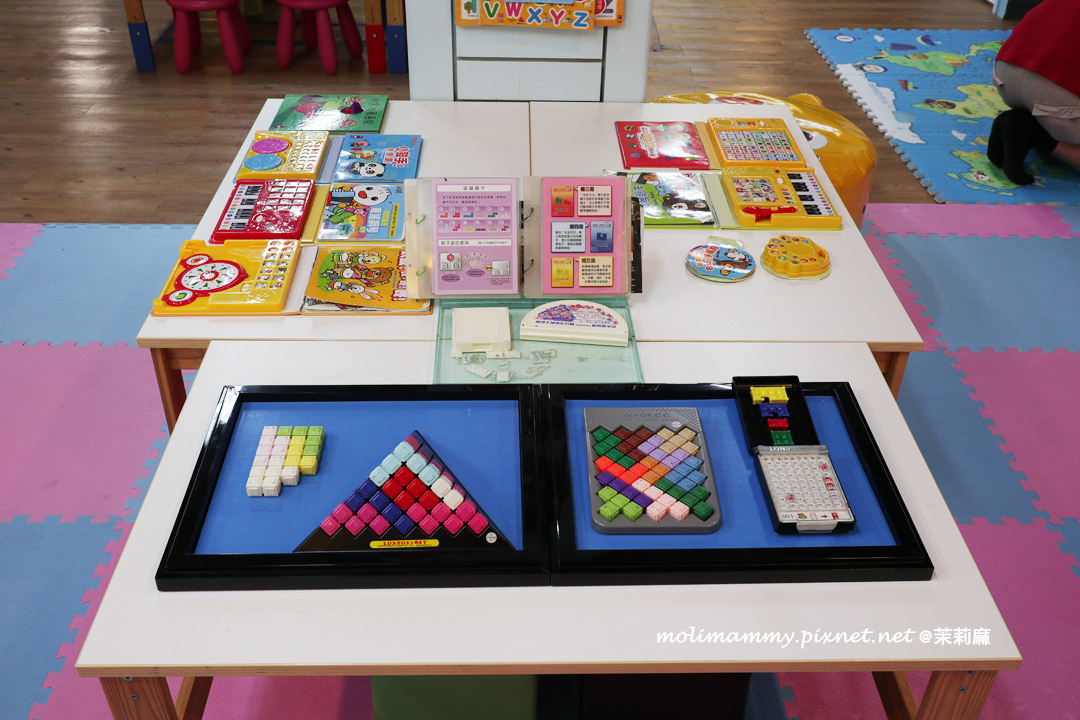 而重點就來到二樓的親子空間啦!這邊提供一區免費的閱讀與遊戲空間,有一整面牆的繪本與教養書可以翻閱,桌上也提供了幾樣玩具給孩子玩