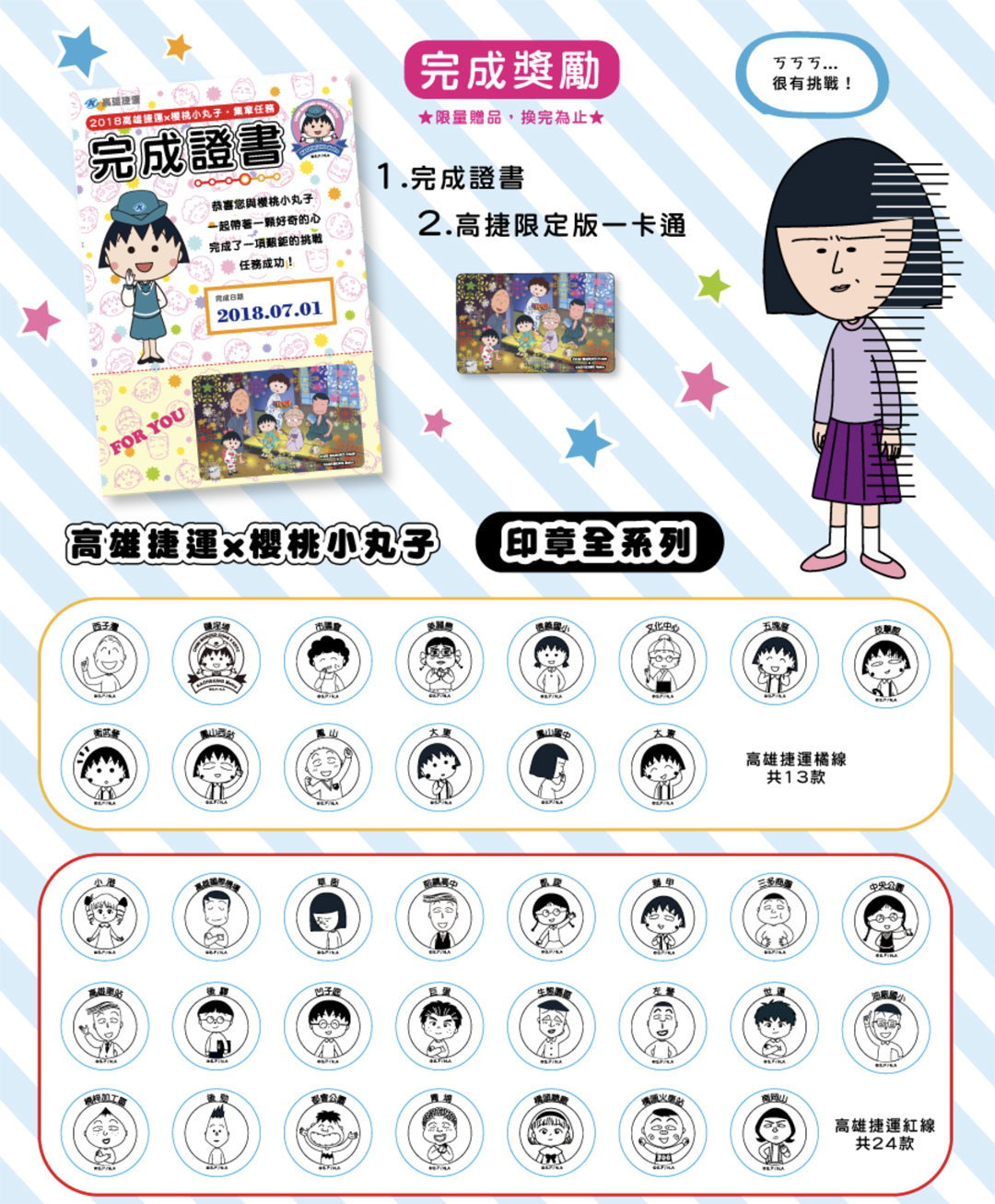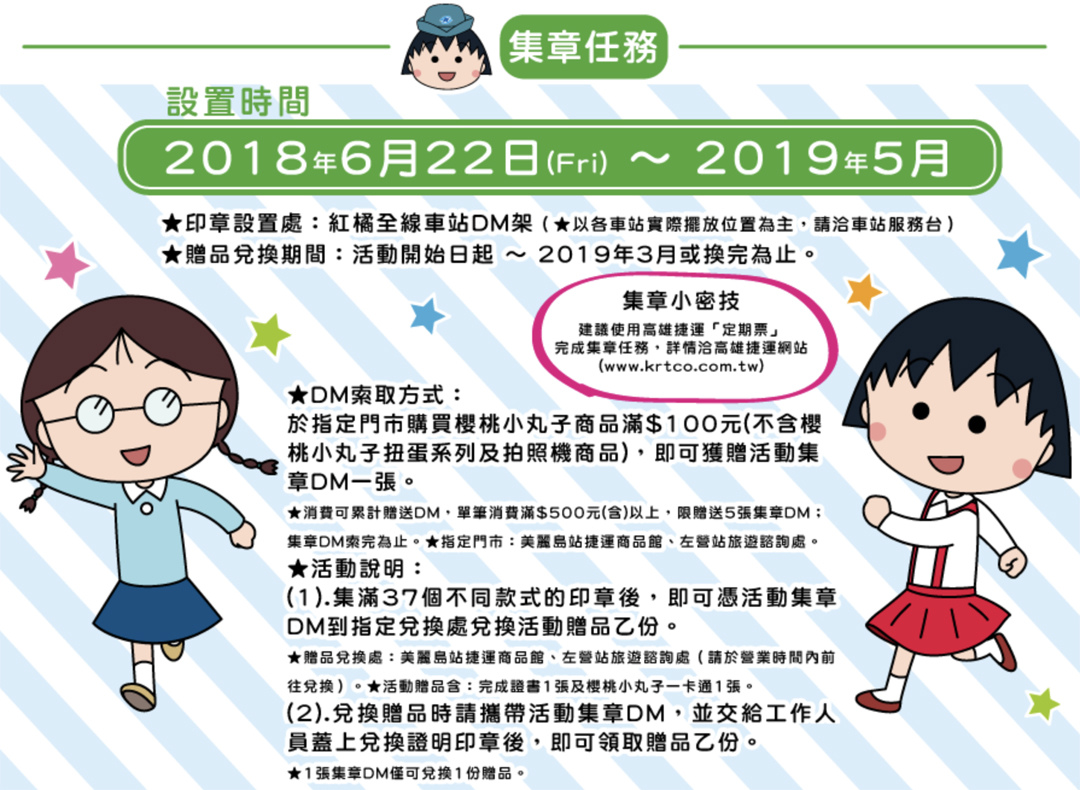 另外還有集章任務!只要在指定門市購買櫻桃小丸子聯名商品滿 100 元,即可領取集章 DM,到高雄捷運各站集章去,集滿 37 個不同款式的印章後,就能獲得獎勵囉