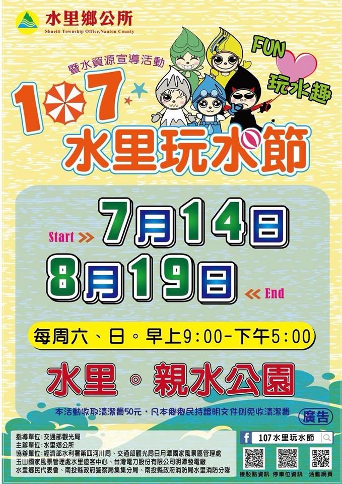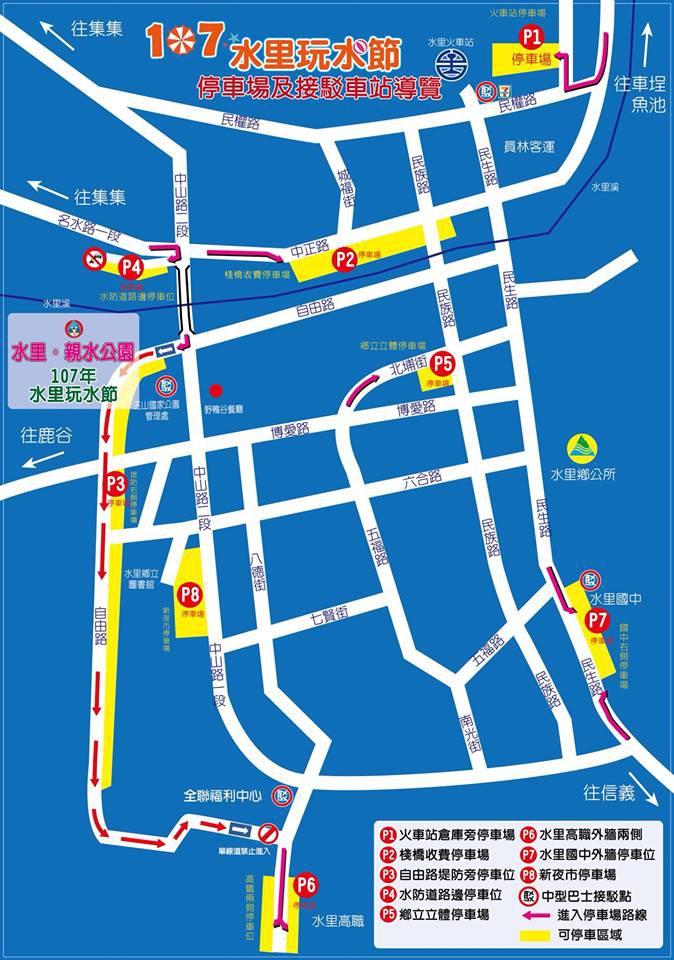 接駁車:水里火車站↔水里親水公園 (中途停靠:玉管處、新夜市停車場、水里國中站牌、員林客運),活動期間 (7/14~8/19) 每週六、日共12天停車資訊
