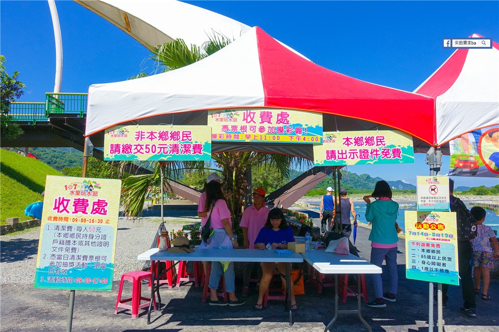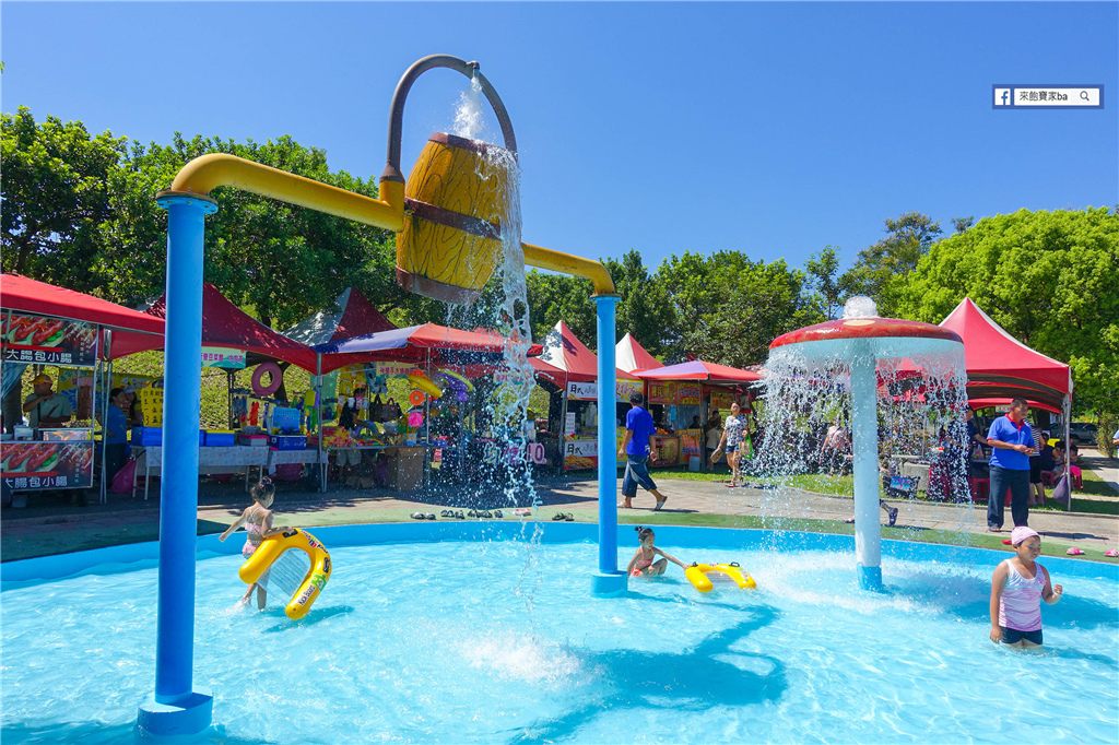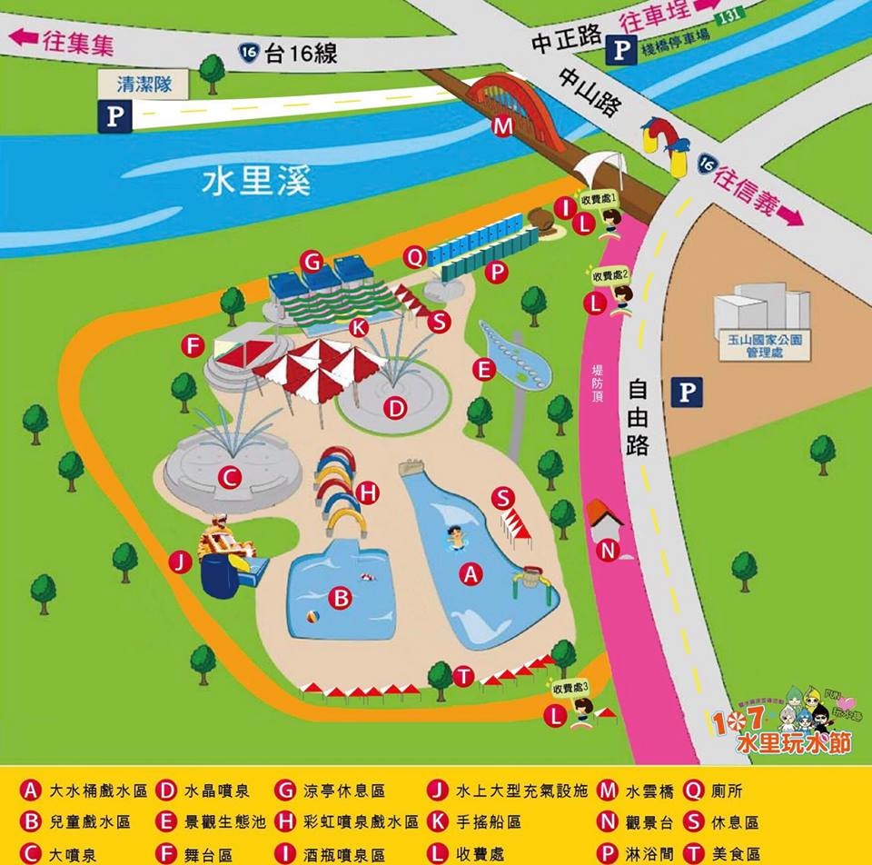 水里玩水節活動辦在水里親水公園,設施包含大水桶戲水區、兒童戲水區、大噴泉、水晶噴泉、景觀生態池、水上大型充氣設施、手搖船區,美食區則有攤販進駐